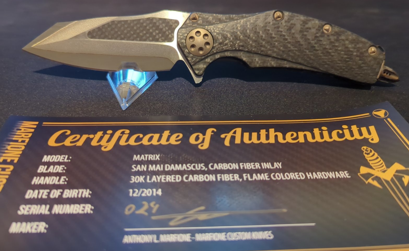 Founder of Microtech Knives, Anthony Marfione, custom designed this piece. It is very light but also feels extremely sturdy. The balance is very much towards the blade which makes cutting feel very easy.