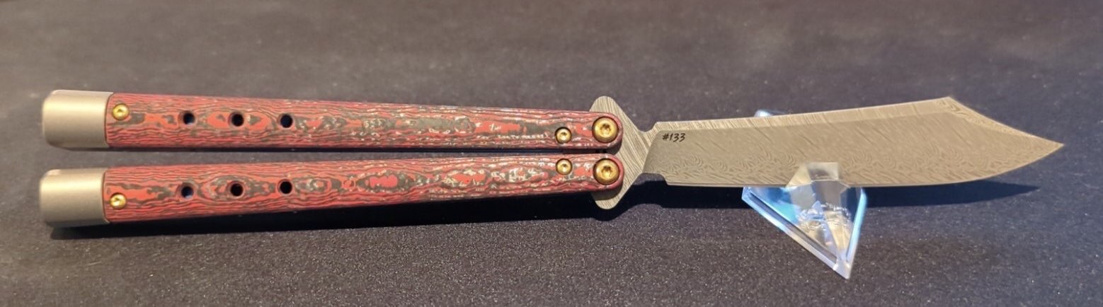 NECRON is the long awaited latest release from Benchmade's Bali lineup, and there are two different gold class options, the lava flow red 99-241 and the jungle wear green 99-242. The fatcarbon fiber handles not only look great, but they feel much more robust and textured than other carbon fibers. The blade has a unique weehawk/scimitar shape with an upper false edge and it is made from Damasteel like its older brother the 51-91. The sky blue titanium liners are a subtle contrast to the red scales on top of them. There is no latch, which means you need to be cognizant of where your bite edge is when storing it in the accompanying black alligator skin pouch.